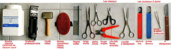 On trouve ces outils spécifiques sur le Web en faisant une recherche, avec les mots clés : accessoires, chiens, toilettage, couteau à épiler.....